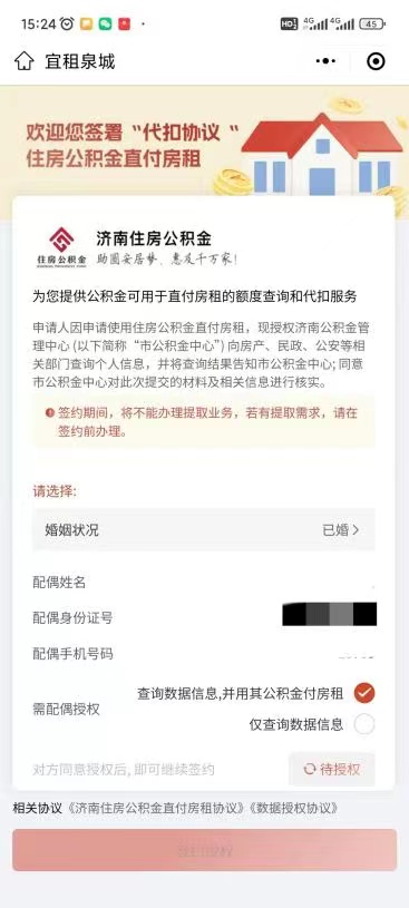 (2)配偶登录“宜租泉城”,点击授权消息协助完成签约授权。
