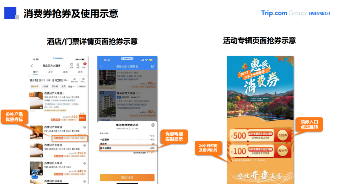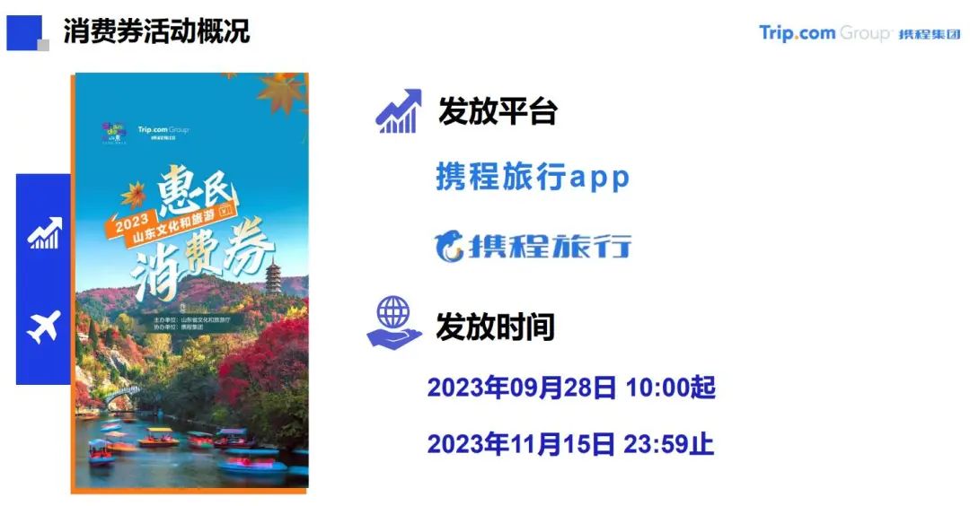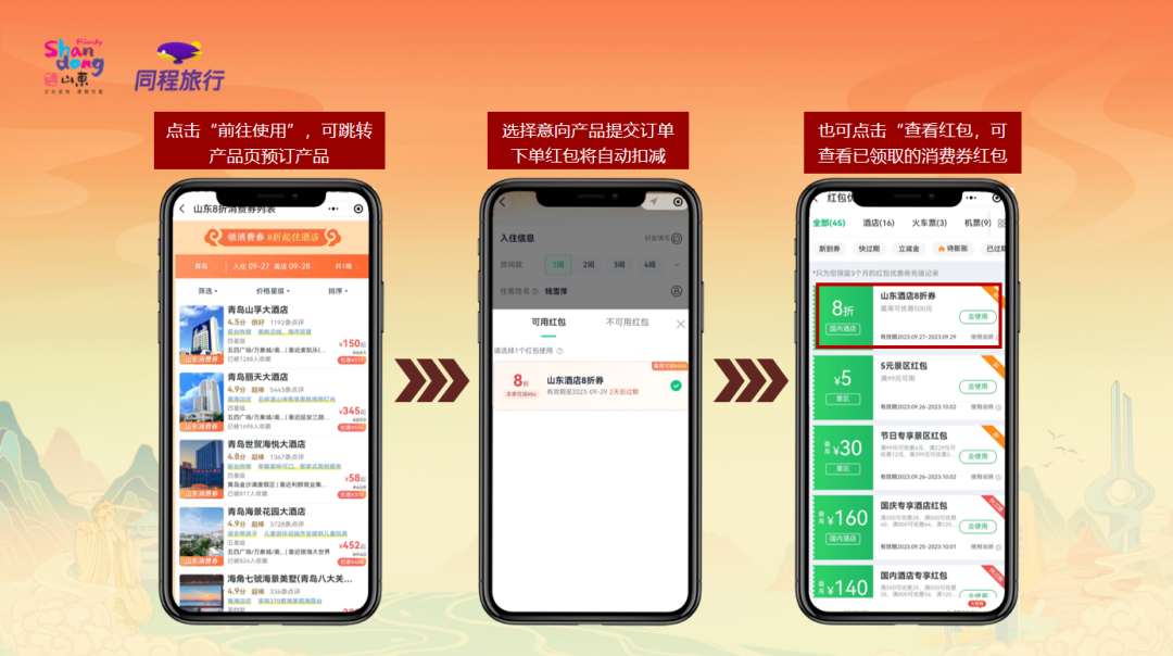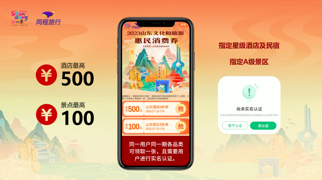 9月28日上午,2023年山东文化和旅游惠民消费券发放启动仪式举行,活动现场同步发放2023年山东文化和旅游惠民消费券。首批发放的山东文化和旅游惠民消费券均为“八折优惠券”,覆盖省内近600家星级饭店、星级民宿、A级景区、剧院的优质文旅产品。发放时间从9月28日一直持续到11月中旬。消费者可以通过携程旅行、同程旅行、保利票务三个平台实名认证后领取消费券,并购买平台上的指定文旅产品,享受八折优惠,先到先得、先领先用。以下是消费券领用攻略。