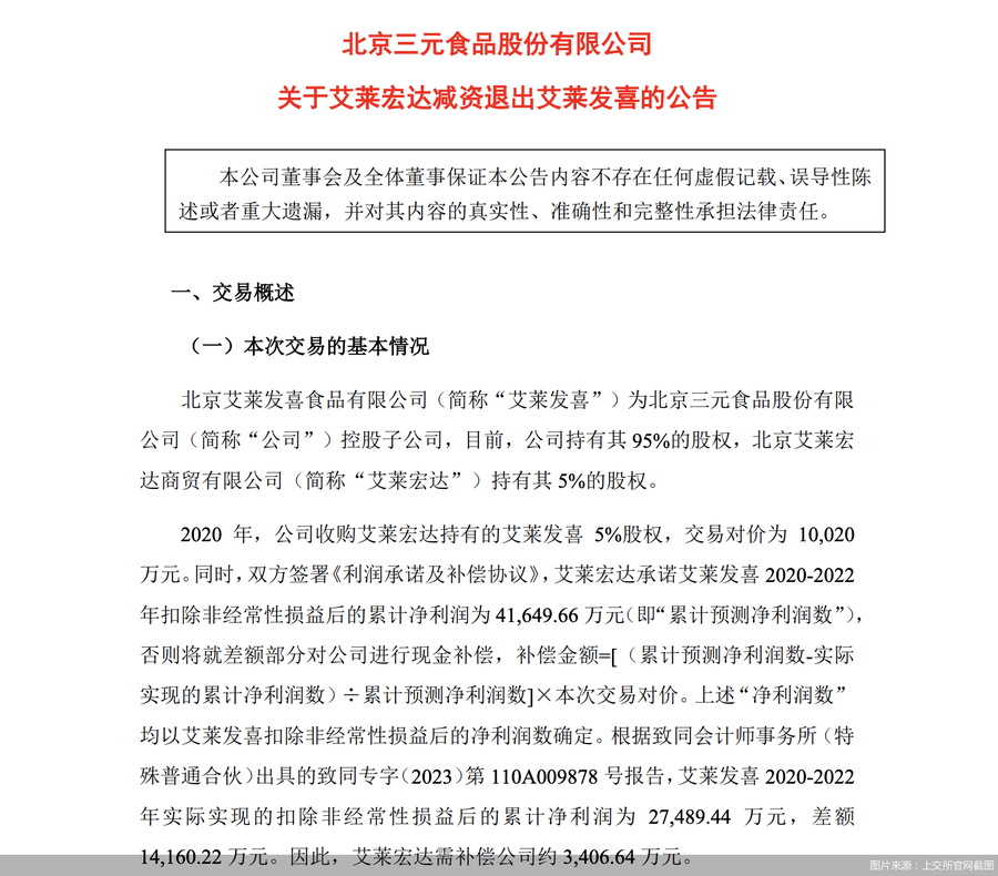 艾莱发喜未完成利润承诺,或是导致这笔收购的直接原因。2020-2022年,艾莱发喜实际实现的扣非后累计净利润为27489.44万元,差额为14160.22万元,艾莱宏达需补偿三元股份约3406.64万元。