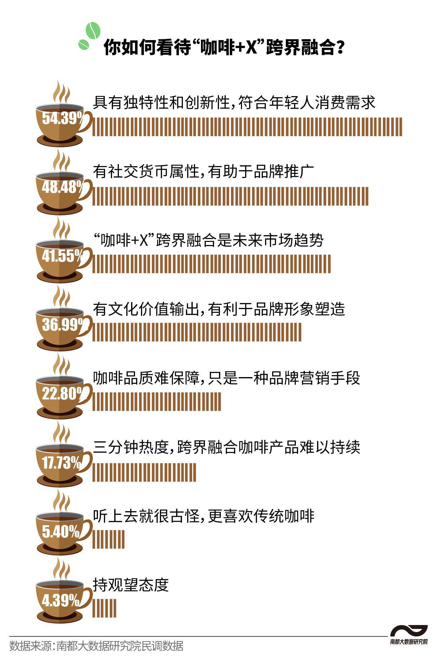 当行业竞争进入白热化阶段,想要脱颖而出似乎变得越来越难,通过联名,不断刺激销售,或是突围的良方。根据南都大数据研究院民调数据,超五成受访消费者都认为“咖啡+X”跨界融合具有独特性和创新性,符合年轻人的消费需求;超48%的受访者表示,“咖啡+X”跨界具有社交货币属性,有助于品牌推广;还有超过40%的受访者认为,“咖啡+X”跨界融合是未来市场趋势。不过,也有约17%的受访者称,跨界咖啡就是三分钟热度,产品难以持续。