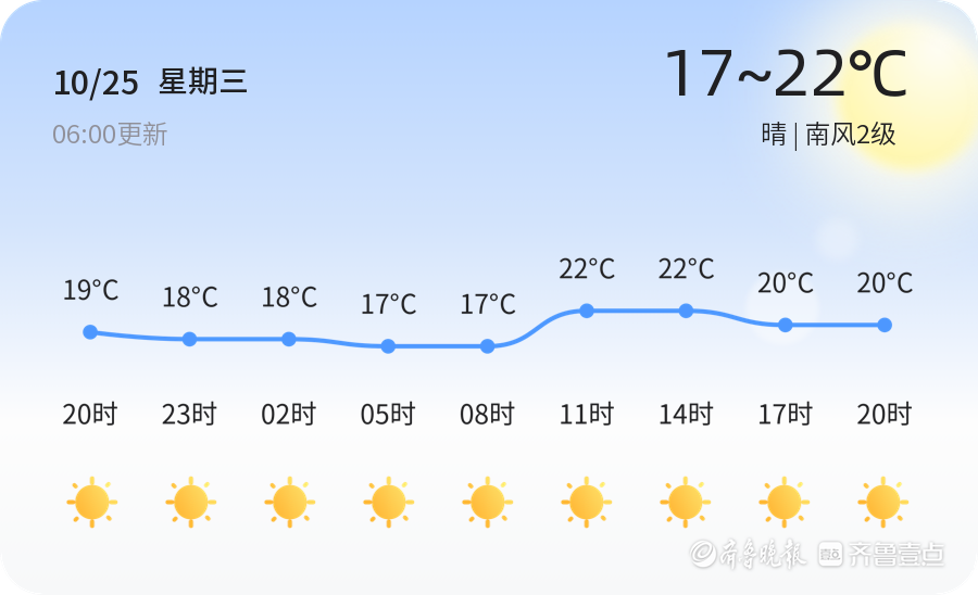 今天是10月25日,星期三,农历九月十一。晴,南风2级。