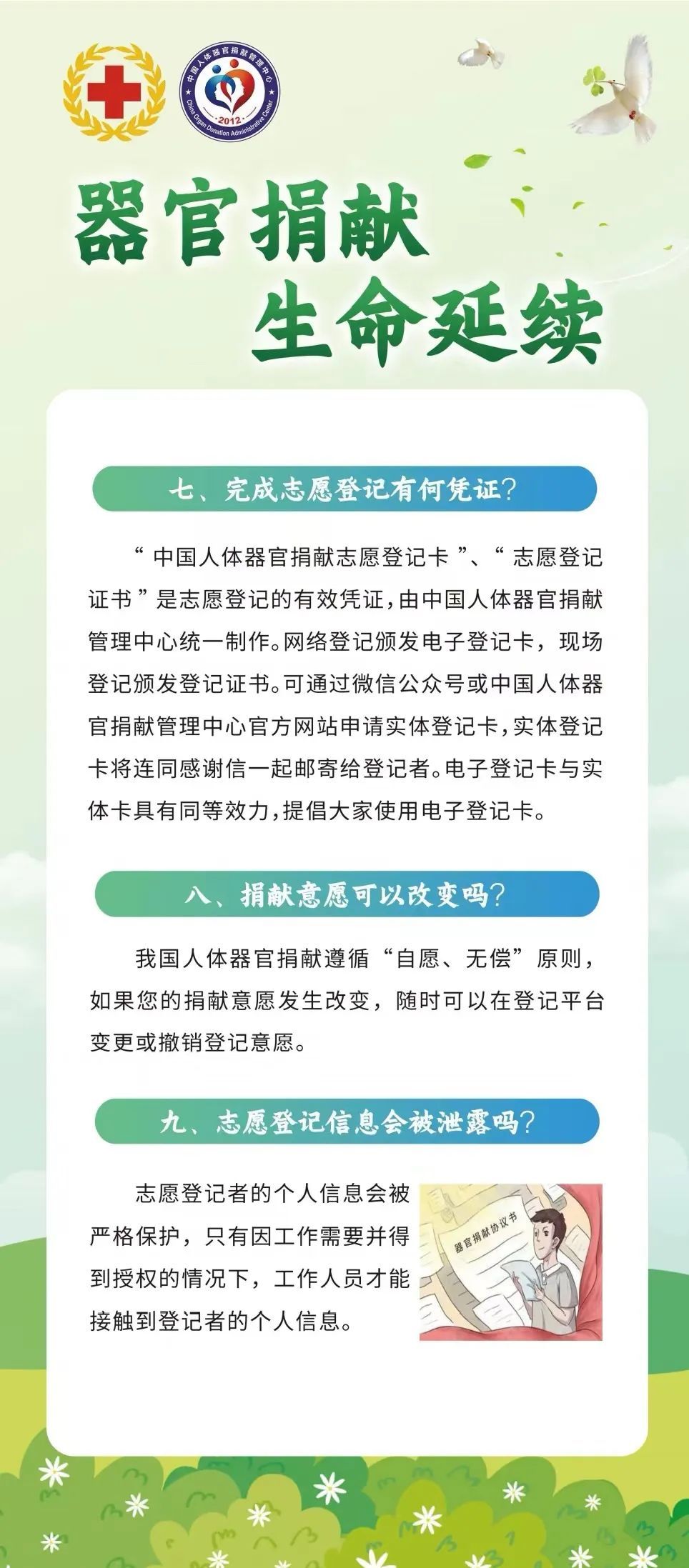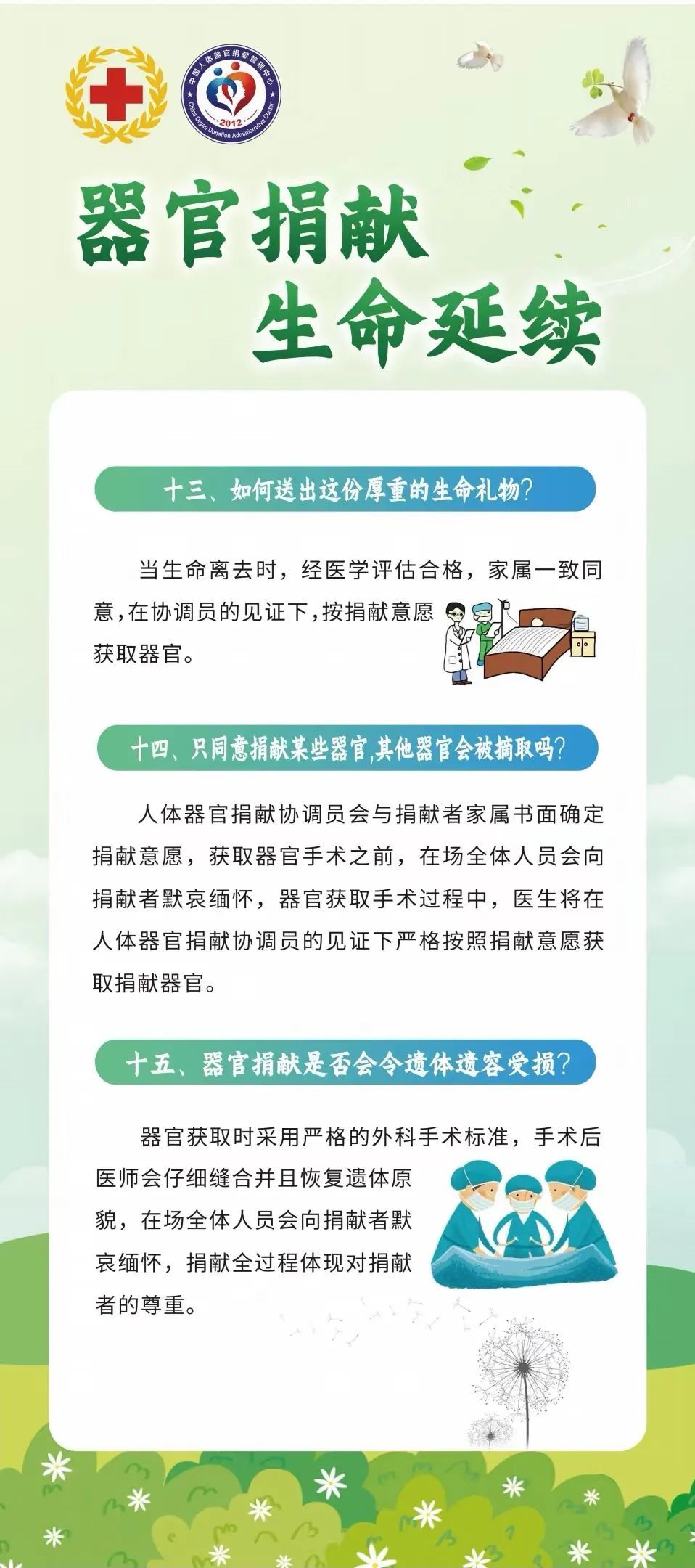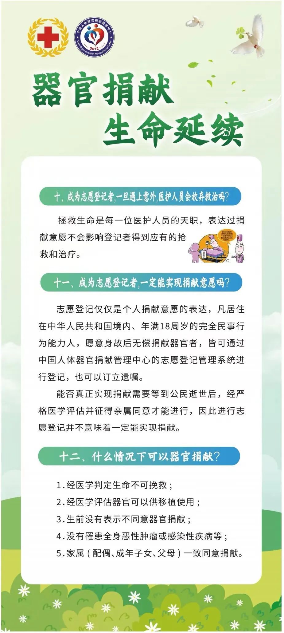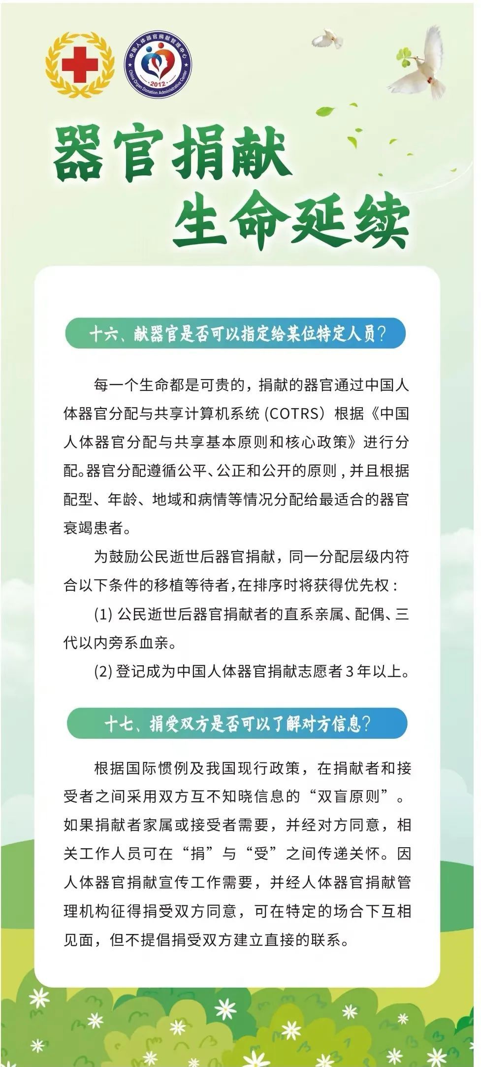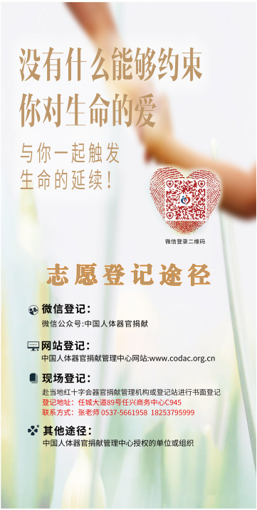 生命有时很脆弱,谁都无法掌控。如果某一天我们要离开,捐献器官既能挽救他人生命,又能让我们的生命以另一种形式在他人身上得到延续!诚挚欢迎社会各界爱心人士关注官方微信公众号“中国人体器官捐献”或登录中国人体器官捐献管理中心官方网站(www.codac.org.cn)进行志愿登记,表达捐献意愿,共同支持人体器官捐献大爱事业。