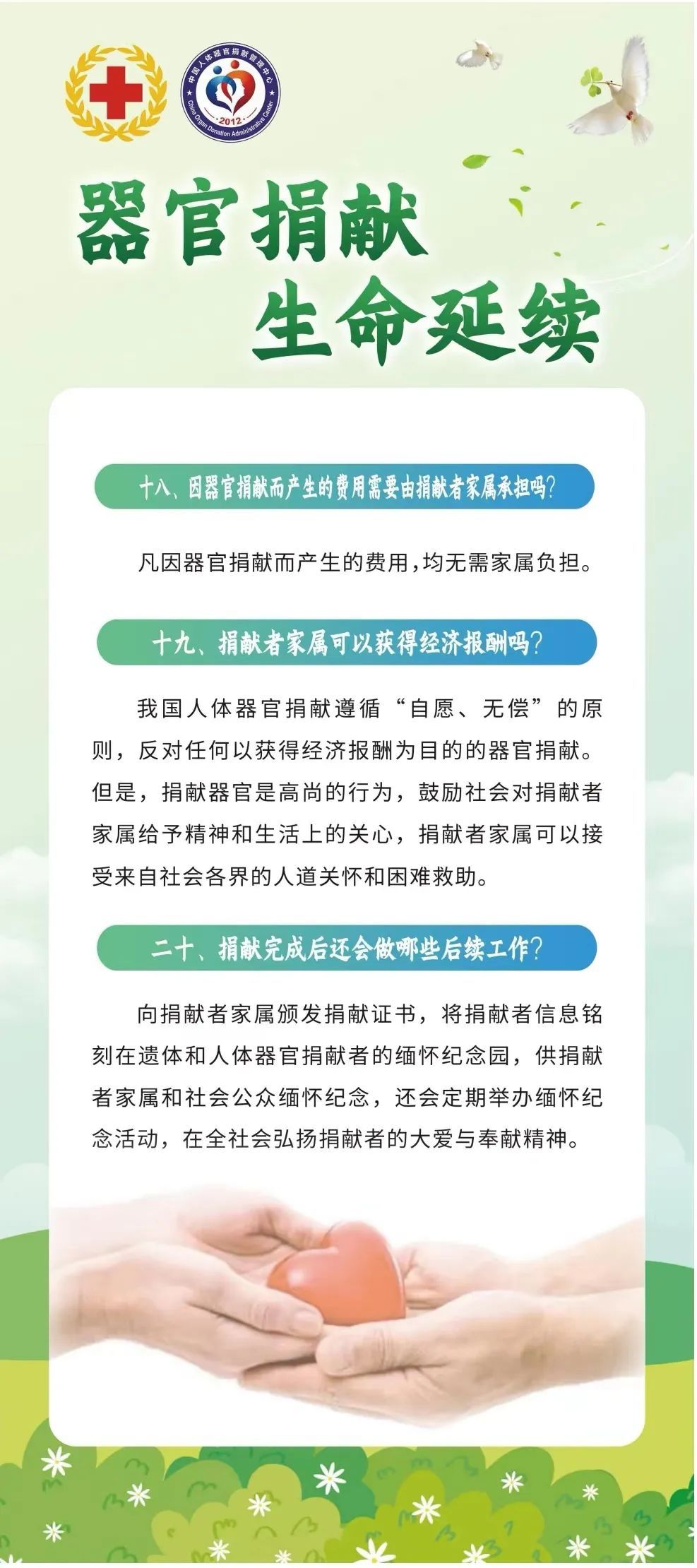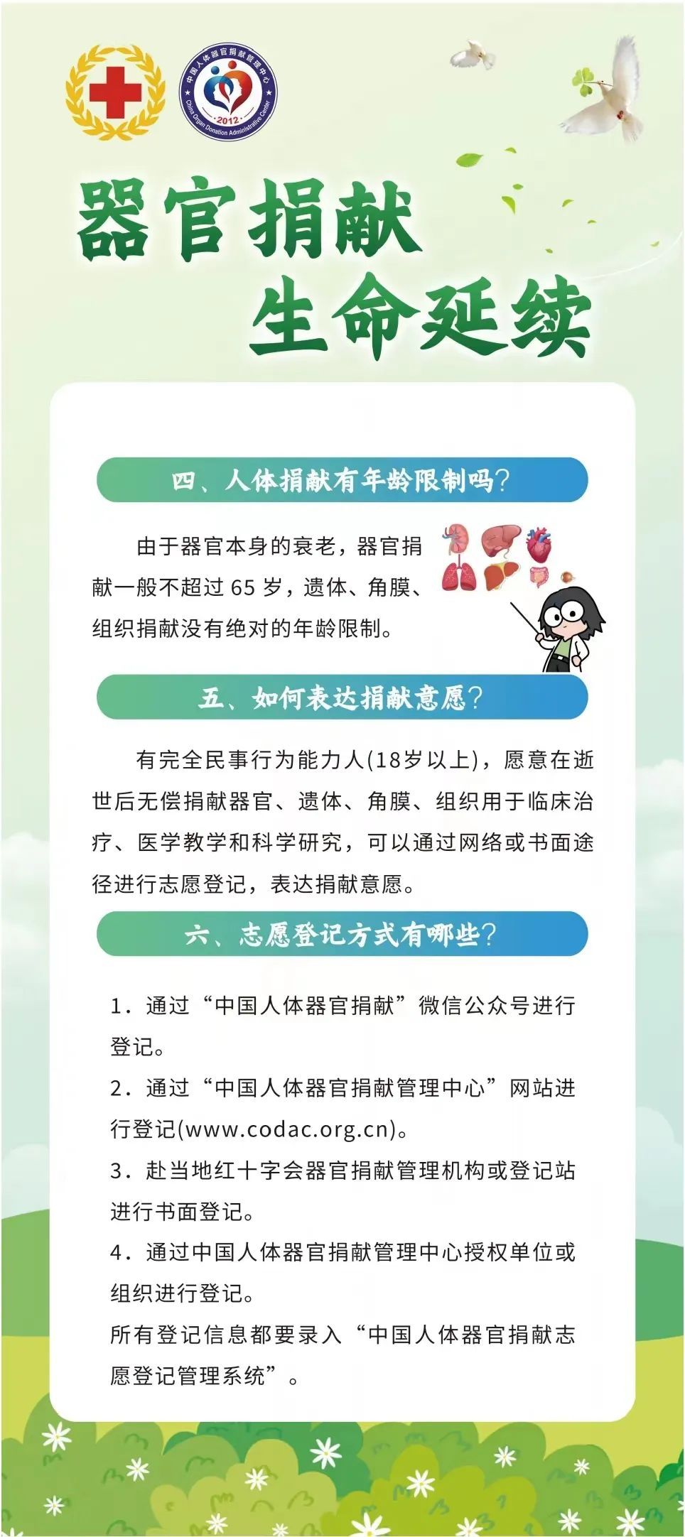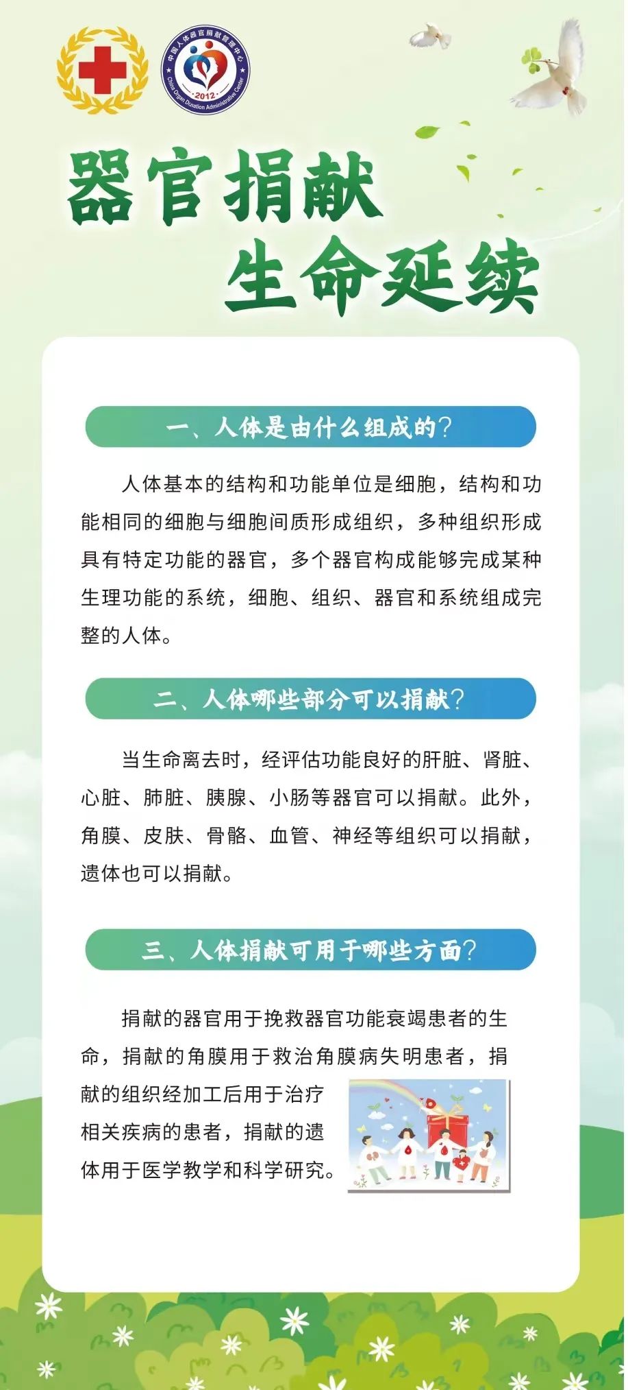 尊敬的市民朋友:人体器官捐献是一项社会公益事业,是造福人类的大爱义举,是社会文明进步的生动体现。卫生健康部门数据显示,我国每年有150万重症患者需要通过器官移植挽救生命,而每年器官移植手术仅1万余例,远远不能满足临床需要。公民去世后捐献器官(含肝脏、肾脏、肺脏、心脏等,以及眼角膜)越来越为人们理解和接受,越来越多的人登记成为志愿者参与其中。