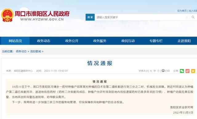 11月1日,周口市淮阳区农业农村局就网传“村民抢中药事件”发布情况通报:10月31日下午,周口市淮阳区冯塘乡一药材种植户邱某某对种植的白术在第二遍收割进行到三分之二时,机械发生故障。