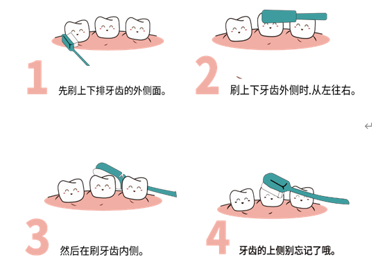 一口好的牙齿不仅健康,笑起来也好看,健康口腔指的是:牙齿清洁、无龋洞、无痛感、牙龈颜色正常、无出血现象。应做到每天早晚各一次,并尽可能做到餐后刷牙,每次刷牙2~3分钟。那么你刷牙的步骤是否正确呢?让我们来看看正确的刷牙四部曲吧。