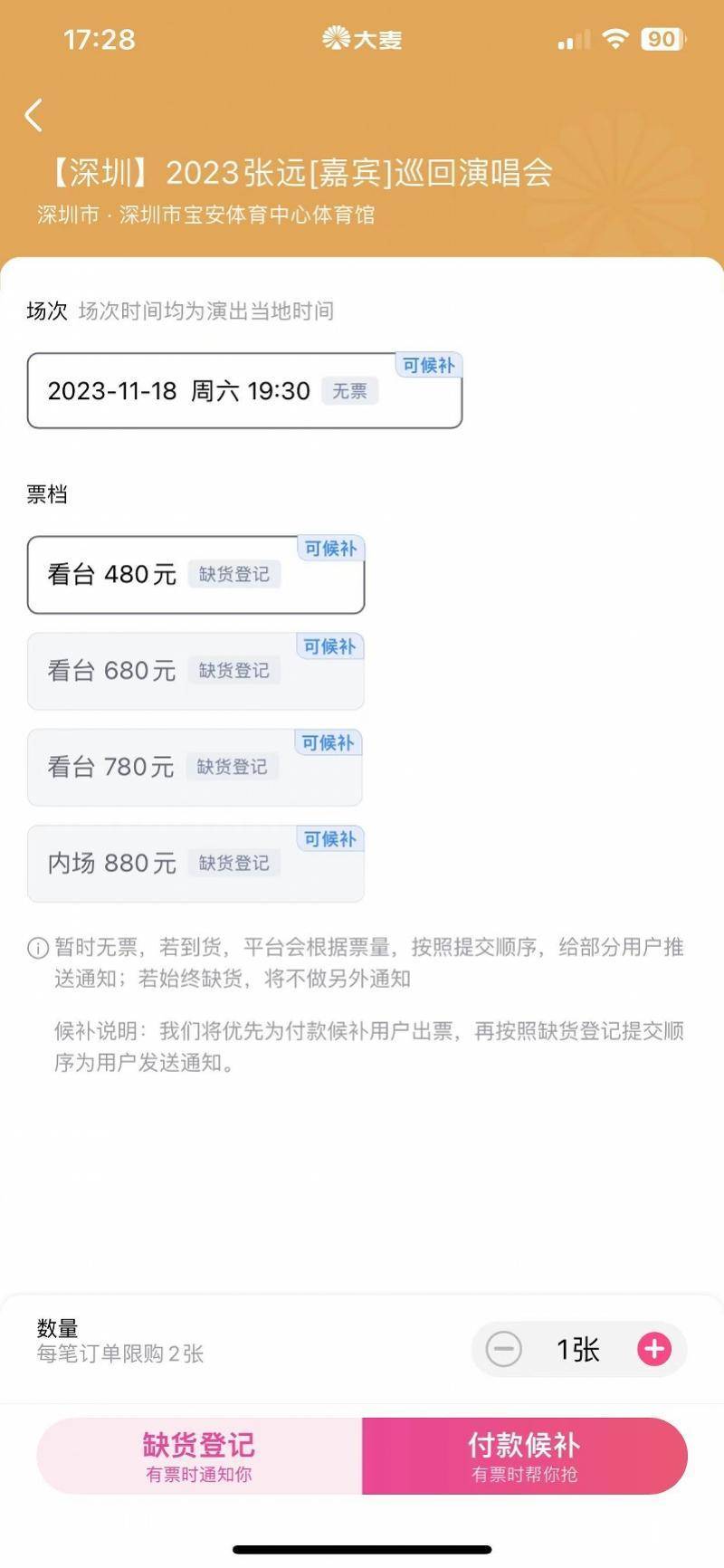 11月6日,南都记者发现大麦平台针对个别演唱会上线了门票候补功能。在门票售罄的情况下,除了“缺货登记”的选项,还增加了“付款候补”,平台能在有票时自动帮抢票。南都记者询问大麦官方客服得到的回复是,该功能于今日正式上线,用户可在开启该功能后通过app获得消息提醒。目前候补功能仅限支持条件退的电子票演出开启该功能。不少网友知悉新功能上线后戏称这是“大麦版12306”。