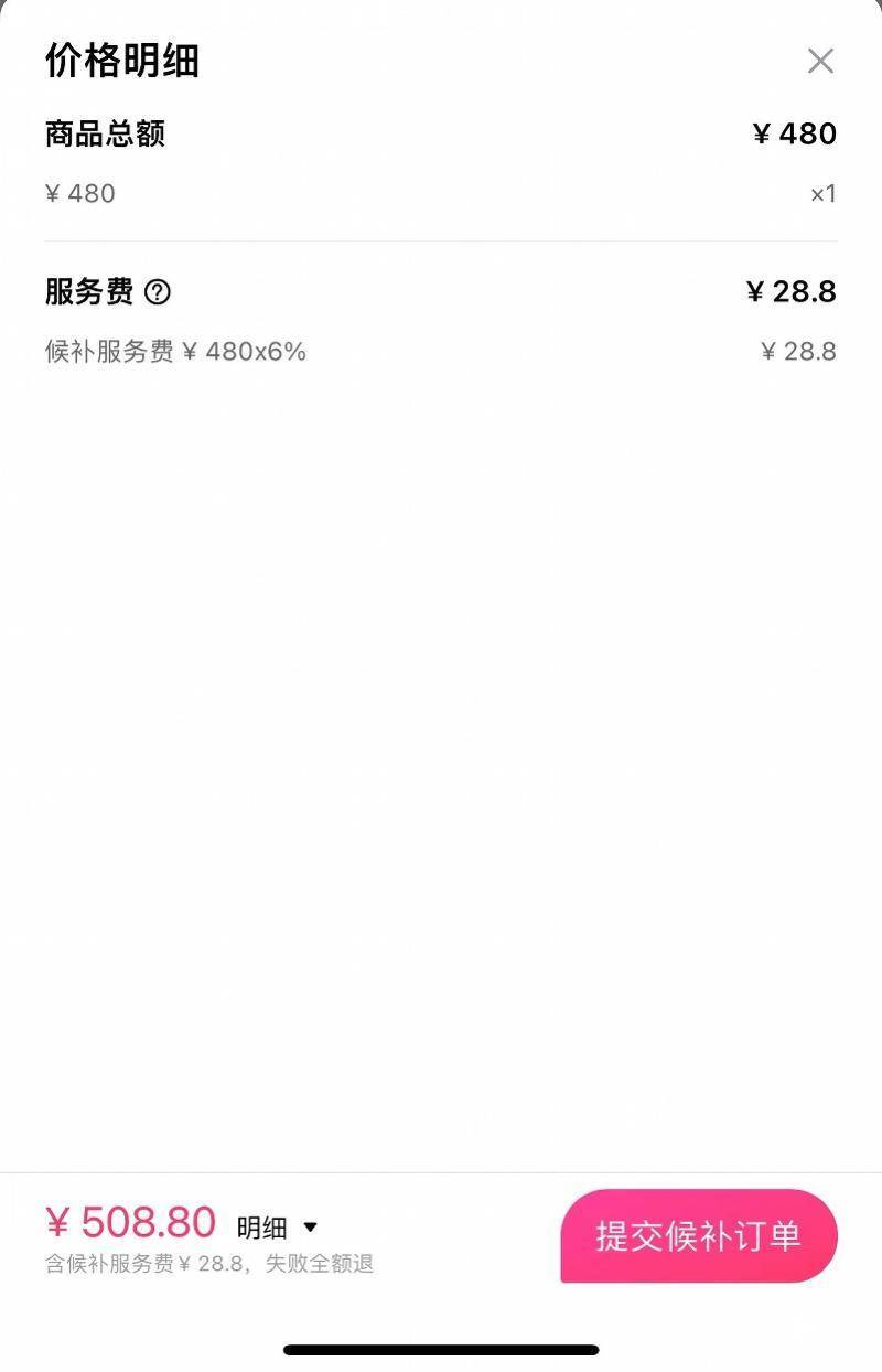 南都记者还发现,在付款明细中,包括了6%的服务费,即一张原价480元的门票,候补订单总价为508.8元,其中包含了28.8元的手续费。