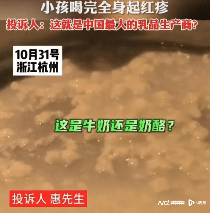 根据浙江经视相关报道,消费者惠先生所表示,自家小孩在喝了一口特仑苏有机纯牛奶后,感觉有一股怪怪的味道。惠先生拆开牛奶盒后发现,牛奶呈块状。随后的两天内,孩子身上出现了疹子,疑似出现过敏症状。