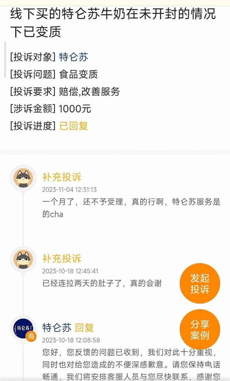 对于此次事件,南都·湾财社记者在黑猫投诉平台上,通过检索“特仑苏”后出现了1337个相关投诉,其中部分投诉带有“变质”“有异物”“口感不佳”等关键词。在这一类质量问题的投诉中,有消费者表示喝下了未开封却已变质的特仑苏后出现了多日腹泻的症状,期间特仑苏虽有于其进行交涉,但根据最新的投诉补充内容,该投诉在近期仍未得到受理解决。
