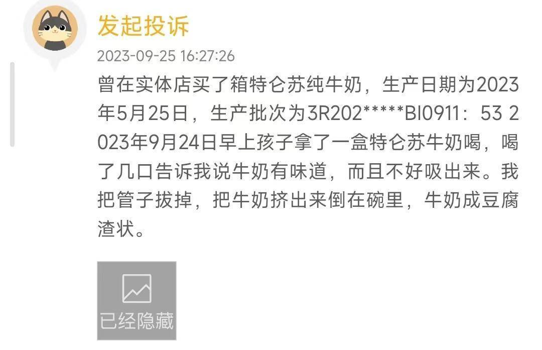蒙牛特仑苏出现质量问题?近日,家住杭州的惠先生向媒体投诉称,自家小孩在喝了一口特仑苏有机纯牛奶后感觉有一股怪怪的味道,在拆开牛奶盒后发现牛奶呈块状。随后的两天内,孩子身上出现了疹子,疑似出现过敏症状。蒙牛此前接受媒体采访时表示,牛奶变质一般可能的原因有商超、消费者存储不当,或在运输环节出现了胀袋,这些肉眼很难发现。对此,南都湾财社记者向蒙牛方面相关负责人进行求证,对方表示“杭州的问题已经解决”,就再未作进一步反馈。