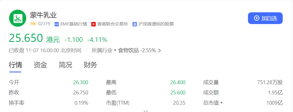截至2023年11月7日收盘,蒙牛乳业(02319.HK)报收于25.65港元,下跌4.11%。
