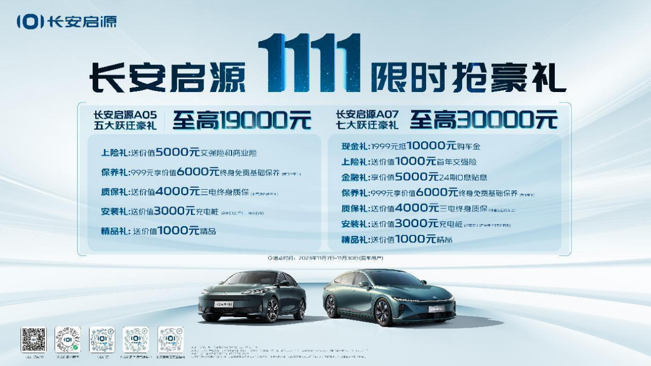 11月7日—11月30日,购长安启源A05立享五大跃迁豪礼,至高19000元!内容包括: