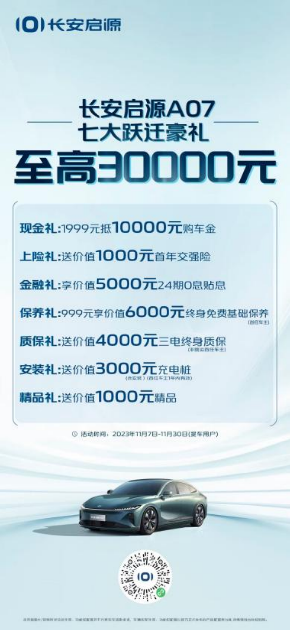 11月7日—11月30日,购长安启源A07立享七大跃迁豪礼,至高30000元!内容包括: