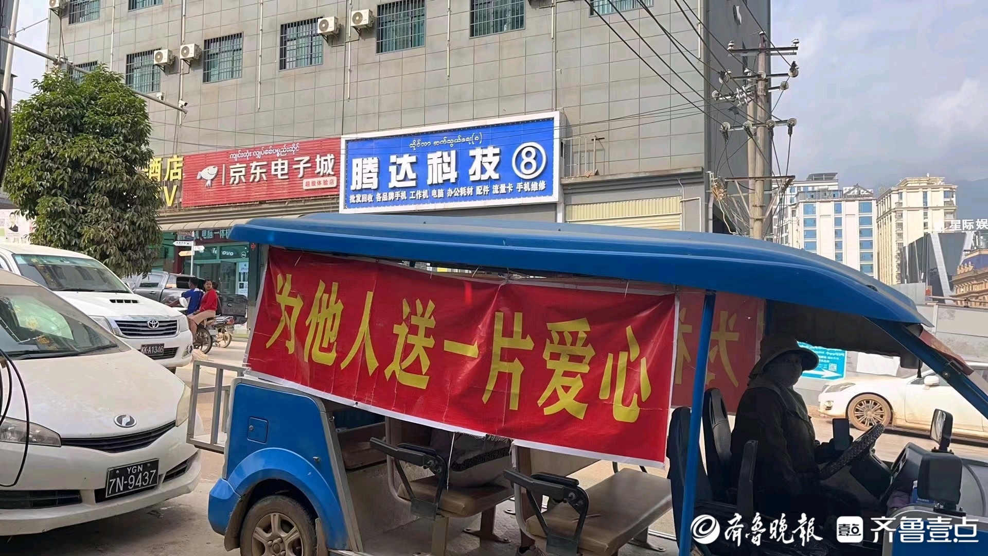 从缅甸果敢老街到中国南伞口岸这一路,李涛开着车,沿途看到很多人在路旁边走着。他的车在路上十分显眼,蓝色的外壳,样子像是景区敞篷式的观光车,两侧挂着中文写的“为他人送一片爱心”“为社会尽一份职责”红色条幅。车子前后也贴着“国门免费接送车”的标识,以及手机号和QQ号、微信号。