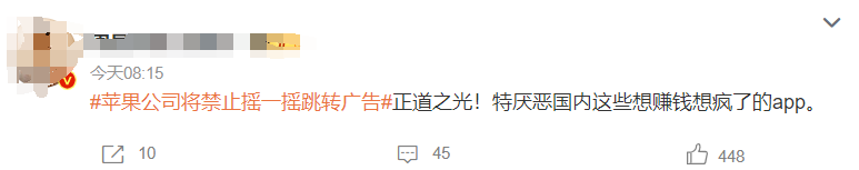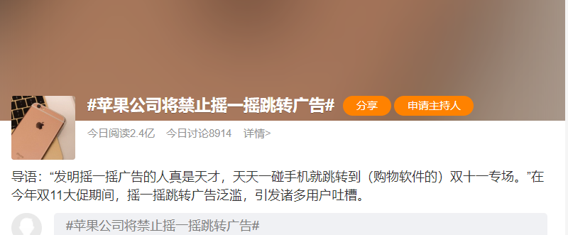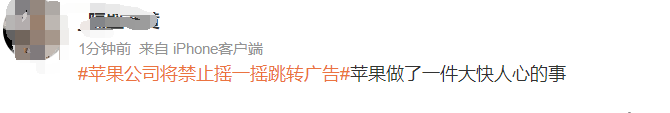 一条#苹果公司将禁止摇一摇跳转广告#的消息更是上了热搜