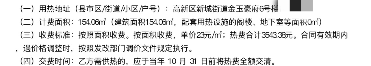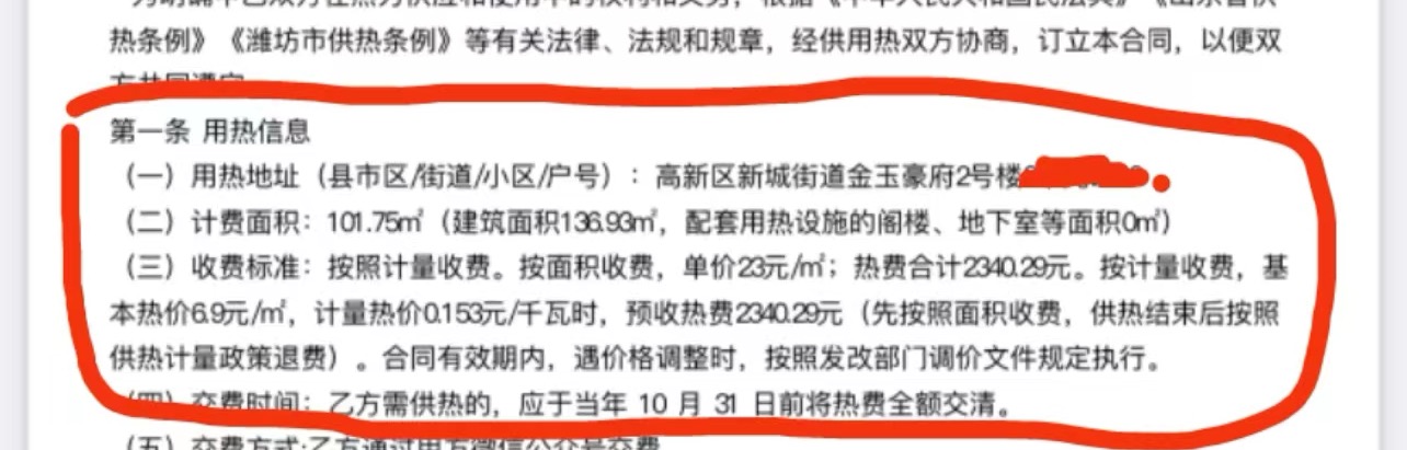 工作人员表示,现在的供暖收费方式本质上都是通过建筑面积供暖,1-4号楼先按建筑面积交费,采暖期结束后按居民两部制供热价格进行结算。因为缴费程序是根据用户的实付金额除以23(今年的供暖价格)得到的一个面积数,这个数字只作为展示。“比如说有一户剩余了300块钱,而他应交2000元,那他实付就是1700,而1-4号楼的合同中的计量面积就是这个1700除以23的结果,我们在合同中也会表明实际的建筑面积,这个数字才是准的。”工作人员给记者举例说到。