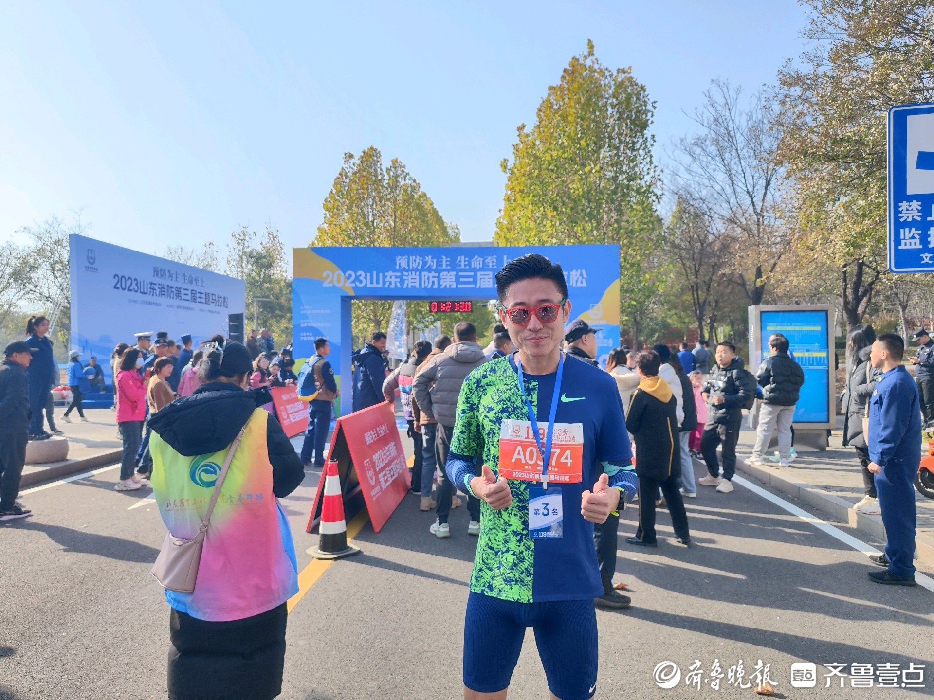 11月19日9时,“预防为主 生命至上”2023山东消防主题马拉松在淄博文昌湖鸣枪起跑!本次赛事由山东省消防救援总队主办,淄博市消防救援支队协办,齐鲁晚报·齐鲁壹点承办。上午10点18分,半程马拉松的季军产生,山东消防的粉丝杨帅以1时18分31秒的成绩完赛。