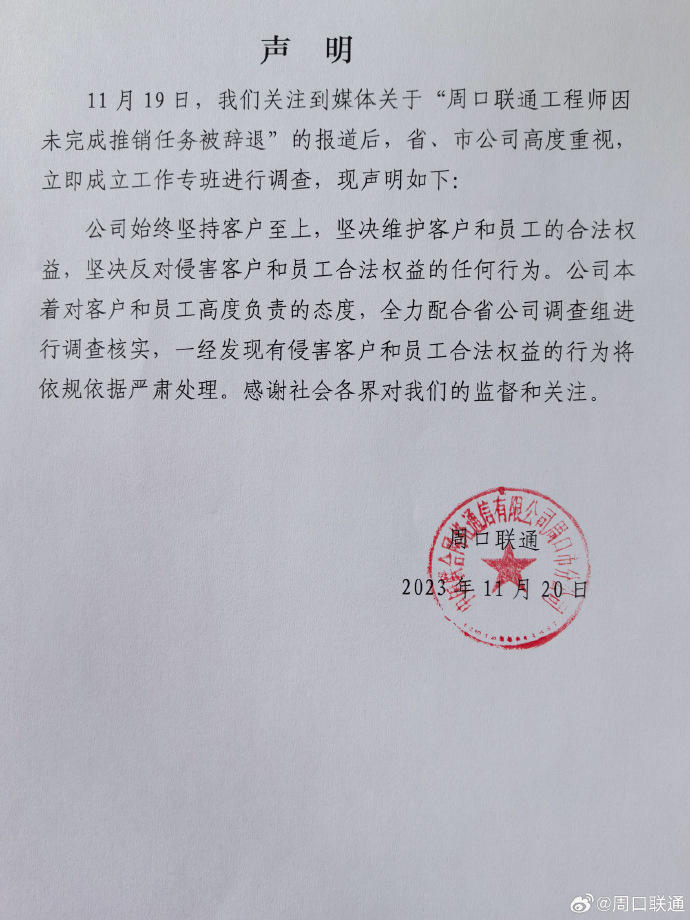 据@周口联通,11月20日,针对河南联通被曝强迫用户更换光猫,@周口联通发布声明回应。