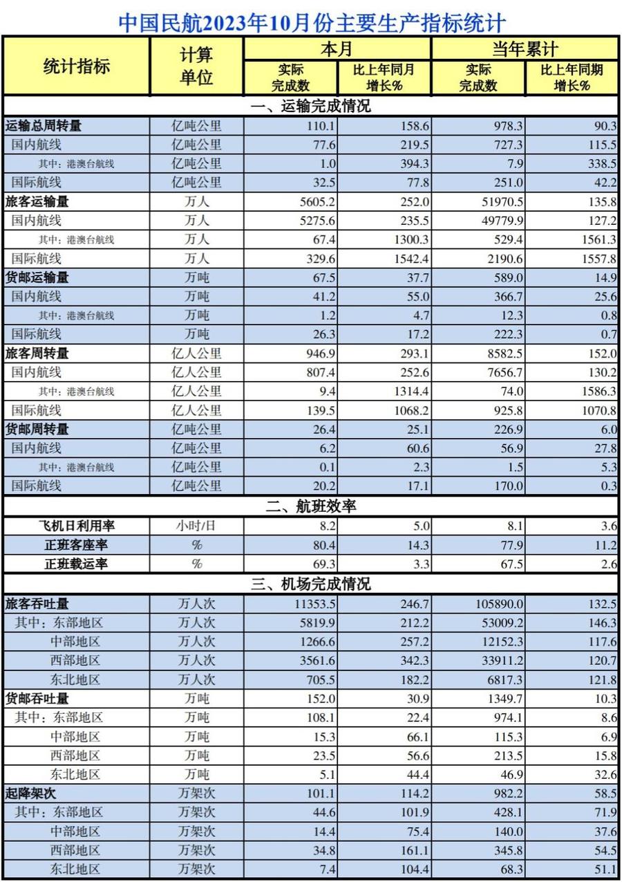 民航局11月20日发布10月份主要生产指标统计显示,今年10月,运输总周转量达到110.1亿吨公里,同比增长158.6%;中国民航旅客运输量达到5605.2万人,同比增长252%;10月货邮运输量为67.5万吨,同比增长37.7%。