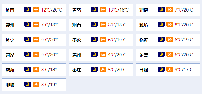 最高气温:淄博、潍坊、菏泽和济宁20℃左右,其他地区18℃左右。