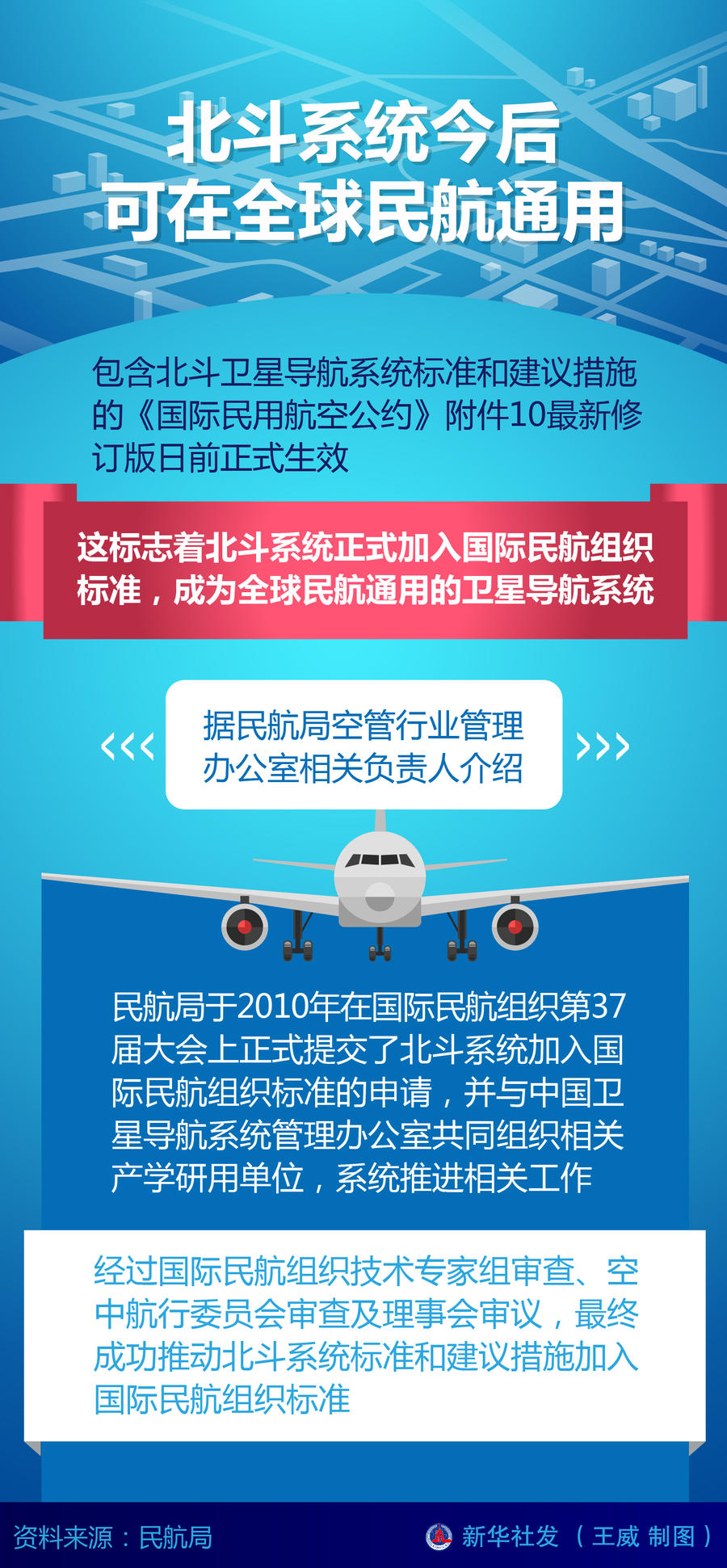 记者20日从民航局获悉,包含北斗卫星导航系统标准和建议措施的《国际民用航空公约》附件10最新修订版日前正式生效,这标志着北斗系统正式加入国际民航组织标准,成为全球民航通用的卫星导航系统。
