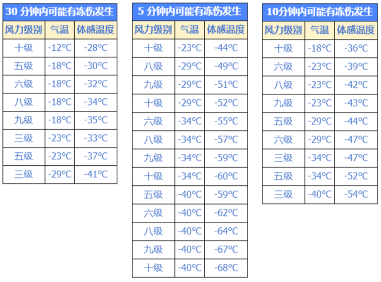 风力级别越高,身体热量流失速度越快,皮肤温度越低。风力级别很高时,即使气温不是特别低,冻伤等严重的天气相关健康问题也更可能发生。不同风力级别和气温时的体感温度和可能发生冻伤的时间见上表。