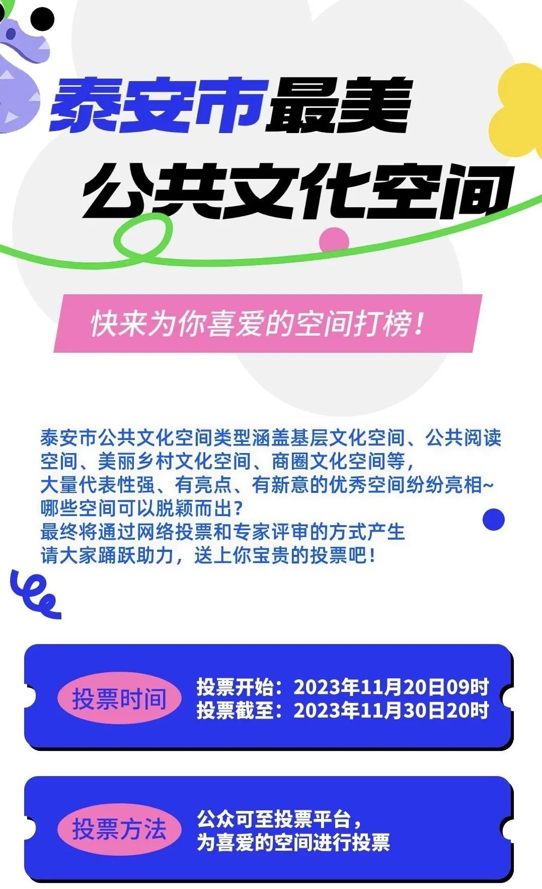 泰安市最美公共文化空间评选开始了!115个你pick谁? 文旅泰安 2023-11-21 1350 泰安市最美公共文化空间评选 开始了!!! 为进一步加强对公共文化设施运行管理,着力打造最美公共文化空间,不断提升全市公共文化服务高质量发展水平,根据文旅部和省文旅厅有关要求,结合泰安实际,经研究,决定组织开展最美公共文化空间创建评选活动。 共115个空间 快来pick你的心中最爱! ↓↓↓ 快送上你宝贵的投票吧! 来源:文旅泰安 责任编辑:赵晴