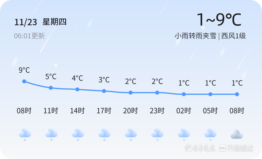 小雨转雨夹雪,温度 1~9℃,西风1级。未来三天最高温度9℃,最低温度-1℃。主要以晴天为主,可能伴有降雨天气,如有有外出的计划,请查询未来几天天气详情。