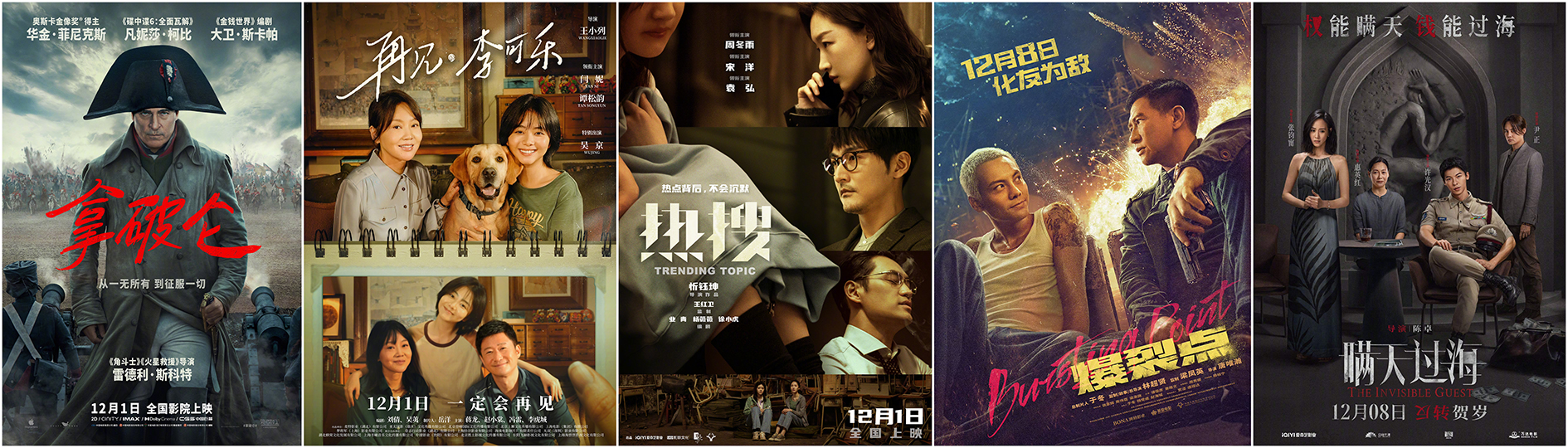 进入12月,一年一度的贺岁档即将拉开序幕。大象新闻记者从奥斯卡电影院线了解到,目前12月定档新片近30部,既有现实题材影片《热搜》、《三大队》、温暖治愈系影片《再见,李可乐》,也有犯罪悬疑片《瞒天过海》、古装历史片《敦煌英雄》,还有职场喜剧片《年会不能停!》。同时,还有多部港味十足动作片《爆裂点》、《怒潮》、《金手指》接连上映,更有《海王2:失落的王国》、《疾速营救》等进口片同场竞技。此外,根据张桂梅真实事迹改编的电影《我本是高山》、庆祝迪士尼成立100周年的献礼作品《星愿》,麦家同名小说改编的电影《刀尖》,曹保平导演新作《涉过愤怒的海》,全球知名动画IP《蜡笔小新》电影系列最新作品,也将在11月末相继登场,这些影片也将持续在12月上映。