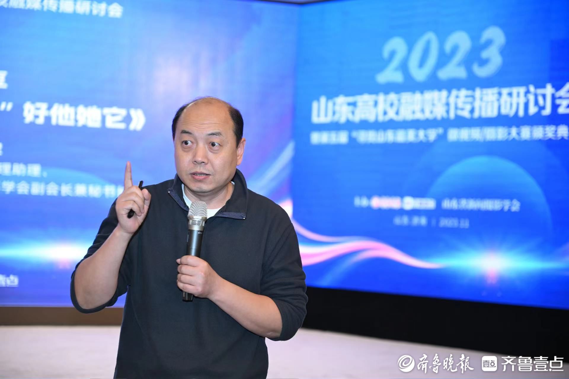 11月29日,齐鲁晚报·齐鲁壹点2023高校融媒传播研讨会暨第五届“寻找山东最美大学”微视频/摄影大赛颁奖典礼举行。活动现场,齐鲁晚报·齐鲁壹点总经理助理、图片新闻中心主任,山东省新闻摄影学会副会长兼秘书长刘军作了《从抒情到共情,“捏”好他她它》的主旨分享。