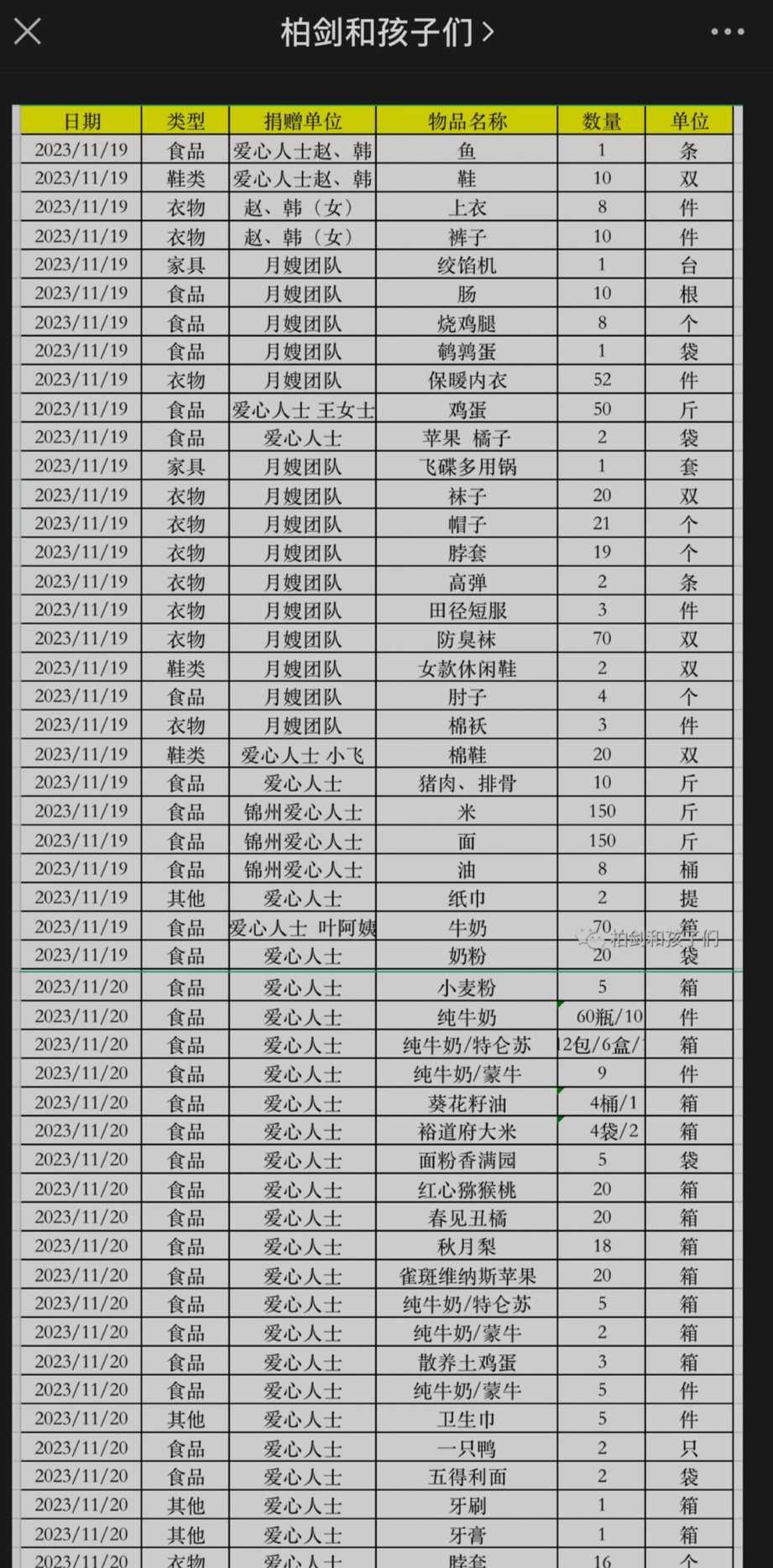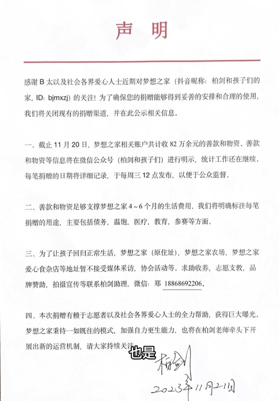 声明内容中写道,“截止11月20日,梦想之家相关账户共计收到82万余元的善款和物资,善款和物资等信息将在微信公众号(柏剑和孩子们)进行明示,统计工作还在继续。”