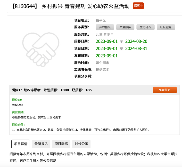 在项目介绍中,该项目为“招募青年志愿者来到乡村,开展围绕乡村振兴主题的志愿活动”,包括美丽乡村环保捡拾垃圾、科技助农大学生帮扶农民、医疗卫生进村等公益活动。根据平台显示,从9月起,已有186人参与了这一项目。