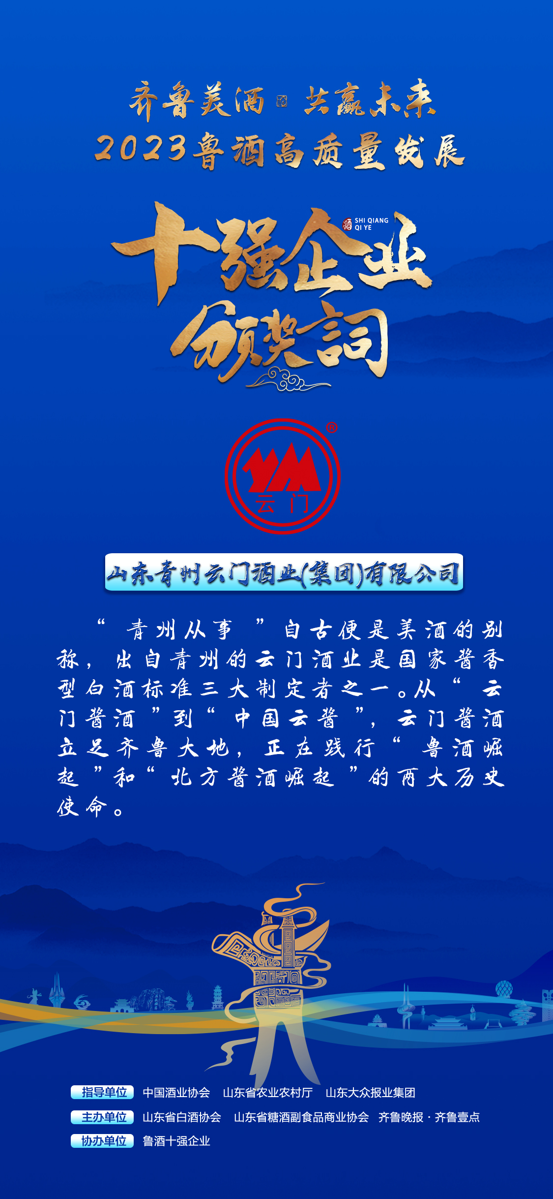 山东青州云门酒业(集团)有限公司获评“2023鲁酒高质量发展十强企业”,颁奖词及海报如下: