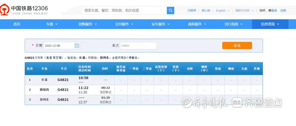 12月8日,济郑高铁将全线贯通运营,济南西至郑州东站间最快1小时43分钟可达,山东半岛城市群与中原城市群时空距离进一步压缩。12月7日,铁路12306App上已经有了济郑高铁相关车次车票销售信息。12月8日的始发车G4821次列车从长清站出发,终点站郑州东站,用时1小时39分,二等座票价为220元。12月9日的G4625次列车从济南站出发,终点站郑州东站,用时2小时整,二等座票价241元。
