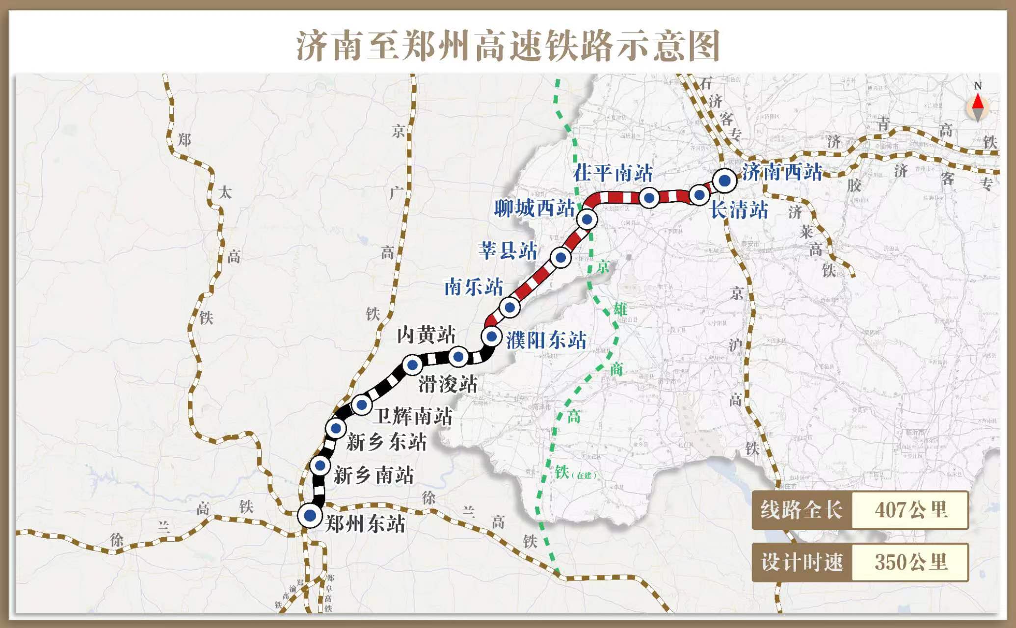 济郑高铁全长407公里,先期实施济郑高铁河南段,从郑州东至濮阳东已于去年6月20日建成通车。2020年3月,济郑高铁山东段正式开工建设。