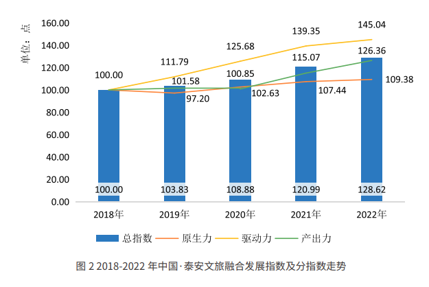 指数显示,2022年泰安文旅融合发展指数达128.62点,同比增长6.31%,较基期增长28.62%,年均复合增长率为6.49%,展现出较强的发展韧性和综合实力。