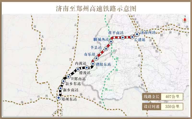 济郑高铁起自济南西站,途经山东省济南市、聊城市,河南省濮阳市、安阳市、新乡市、郑州市,接入郑州东站,线路全长407公里,设计时速350公里,其中濮阳至郑州段已于2022年6月开通运营。本次开通的济郑高铁济濮段线路全长208公里,设济南西、长清、茌平南、聊城西、莘县、南乐、濮阳东7座车站,其中济南西站、濮阳东站为既有车站,其余为新建车站。同步建设的济郑高铁与济南站联络线投入使用,连通胶济高铁和胶济铁路。