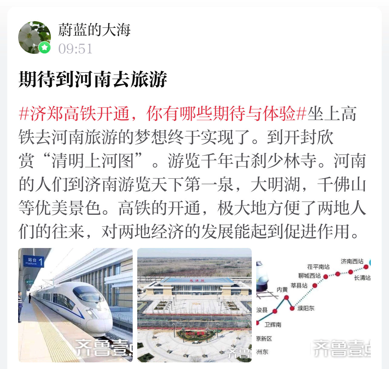 情报员“蔚蓝的大海”:坐上高铁去河南旅游的梦想终于实现了。到开封欣赏“清明上河图”,游览千年古刹少林寺。河南的人们到济南游览天下第一泉、大明湖、千佛山等优美景色。高铁的开通,极大地方便了两地人们的往来,对两地经济的发展能起到促进作用。