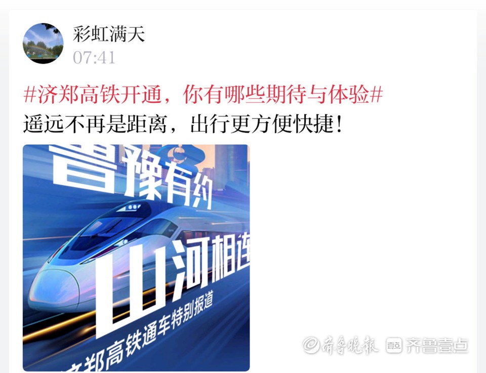 【参与方式】下载齐鲁晚报官方客户端――齐鲁壹点,在情报站点击话题#济郑高铁开通,你有哪些期待与体验#+文字/图片/短视频/音频上传即。