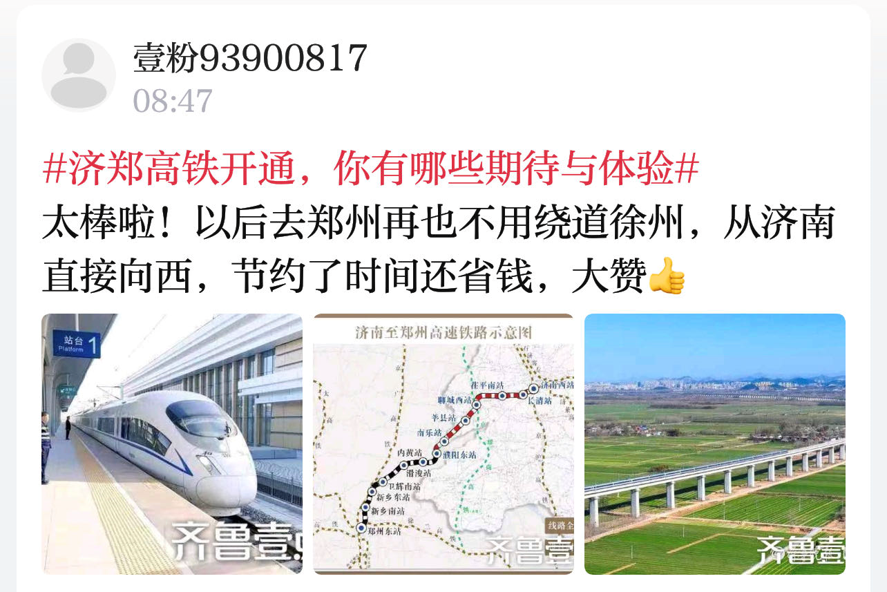 情报员“93900817”:太棒啦!以后去郑州再也不用绕道徐州,从济南直接向西,节约了时间还省钱,大赞!