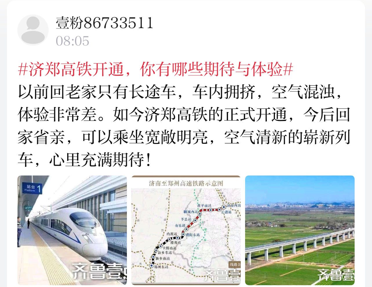 鲁豫牵手,山河相依!济郑高铁今日全线通车。12月8日,情报员纷纷向齐鲁晚报官方客户端齐鲁壹点情报站发来情报,分享济郑高铁通车带来的喜悦。