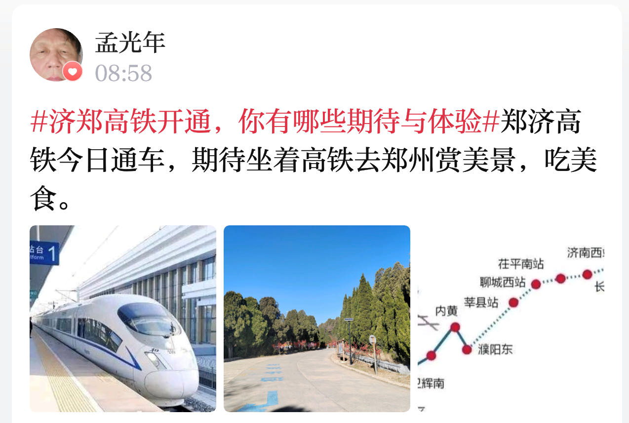 情报员“孟光年”:郑济高铁今日通车,期待坐着高铁去郑州赏美景,吃美食。