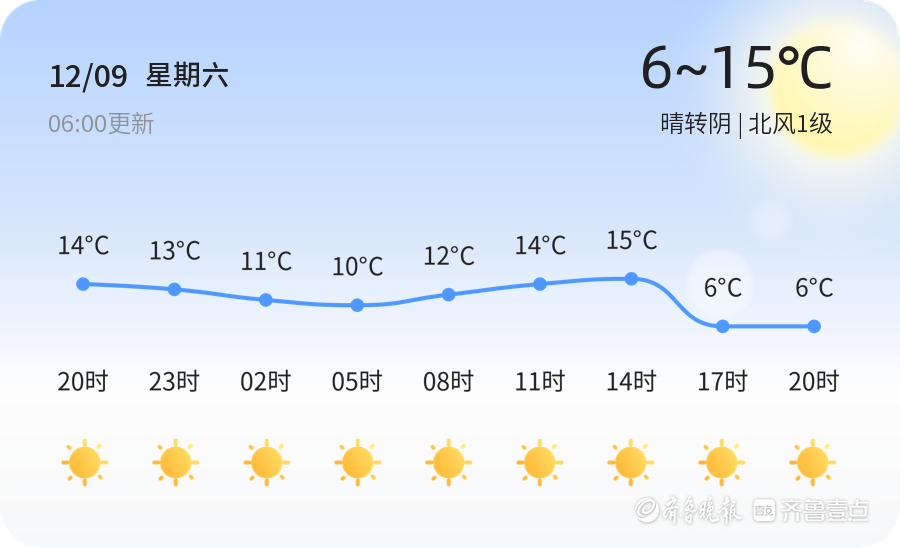 今天是12月9日,星期六,农历十月廿七。晴转阴,北风1级。