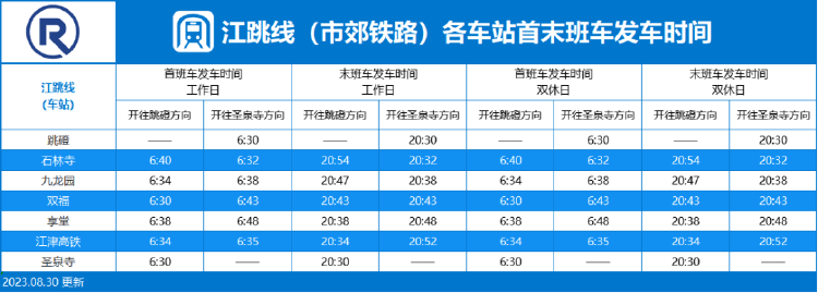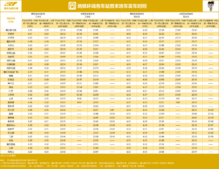 原标题:最新!重庆轨道交通首末班车时间表来啦→ 今(11)日,重庆轨道交通发布消息 单轨2号线运营时刻表有调整 一起来get 各线路首末班车发车时间 ↓↓↓ 地铁环线 地铁1号线 单轨2号线 单轨3号线 地铁4号线 地铁5号线 地铁6号线和国博线 地铁9号线 地铁10号线 江跳线(市郊铁路) 上游新闻