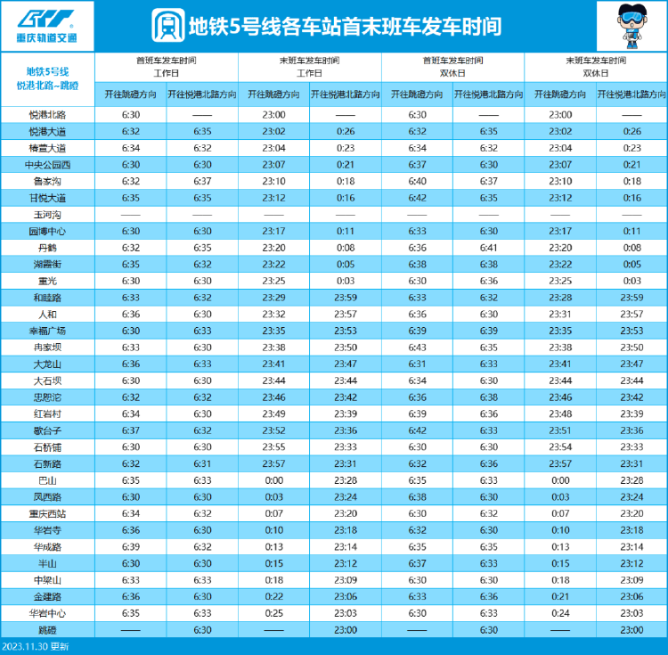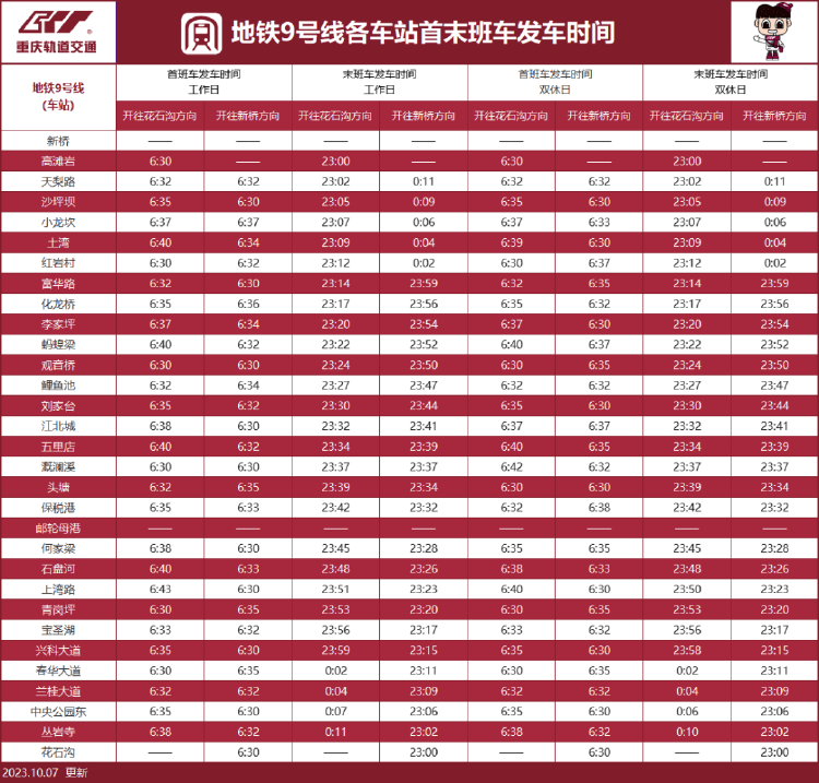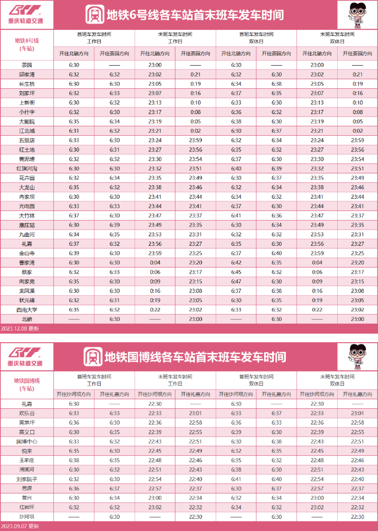 最新!重庆轨道交通首末班车时间表来啦→ 上游新闻 2023-12-11 原标题:最新!重庆轨道交通首末班车时间表来啦→ 今(11)日,重庆轨道交通发布消息 单轨2号线运营时刻表有调整 一起来get 各线路首末班车发车时间 ↓↓↓ 地铁环线 地铁1号线 单轨2号线 单轨3号线 地铁4号线 地铁5号线 地铁6号线和国博线 地铁9号线 地铁10号线 江跳线(市郊铁路) 上游新闻