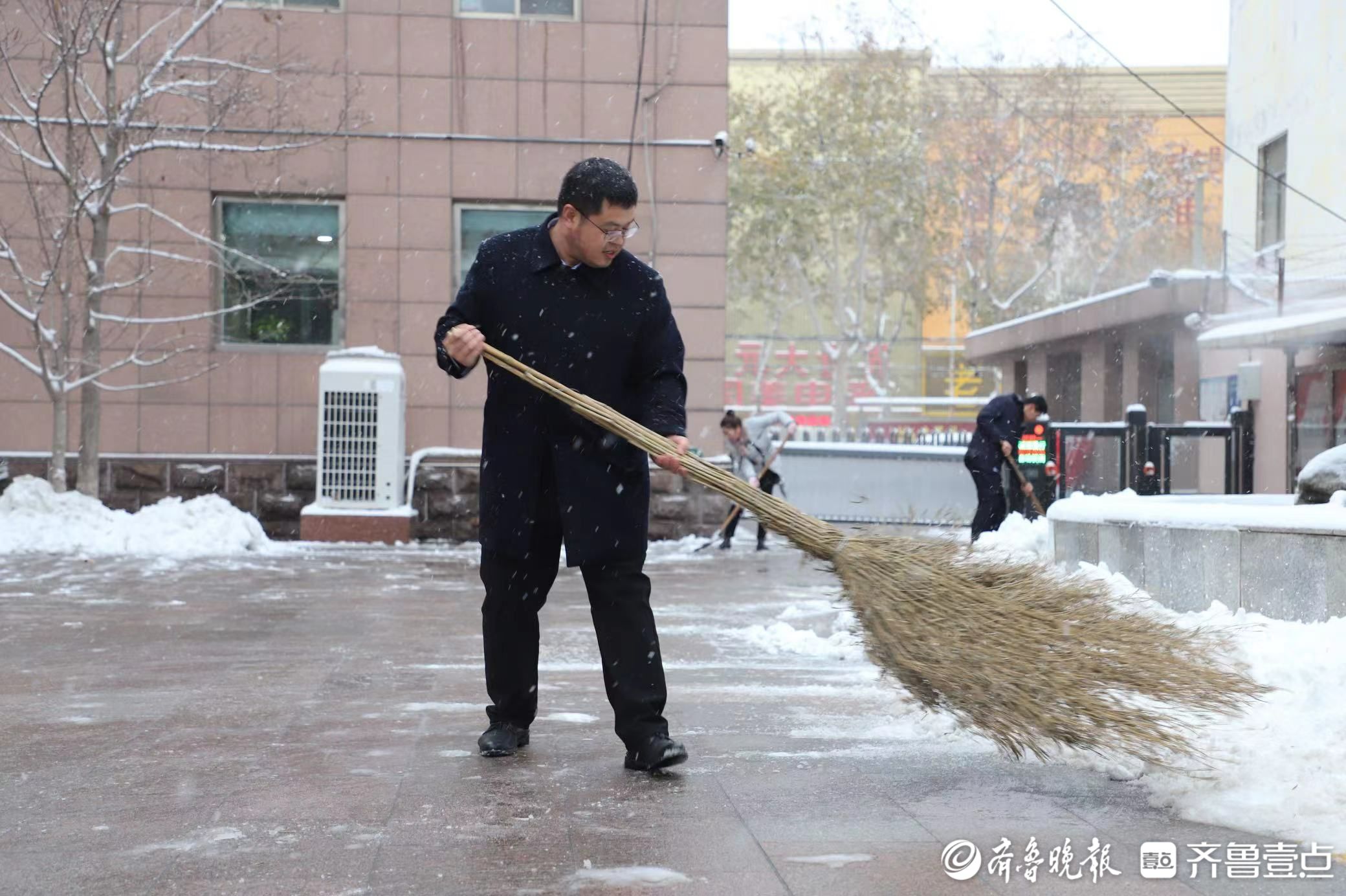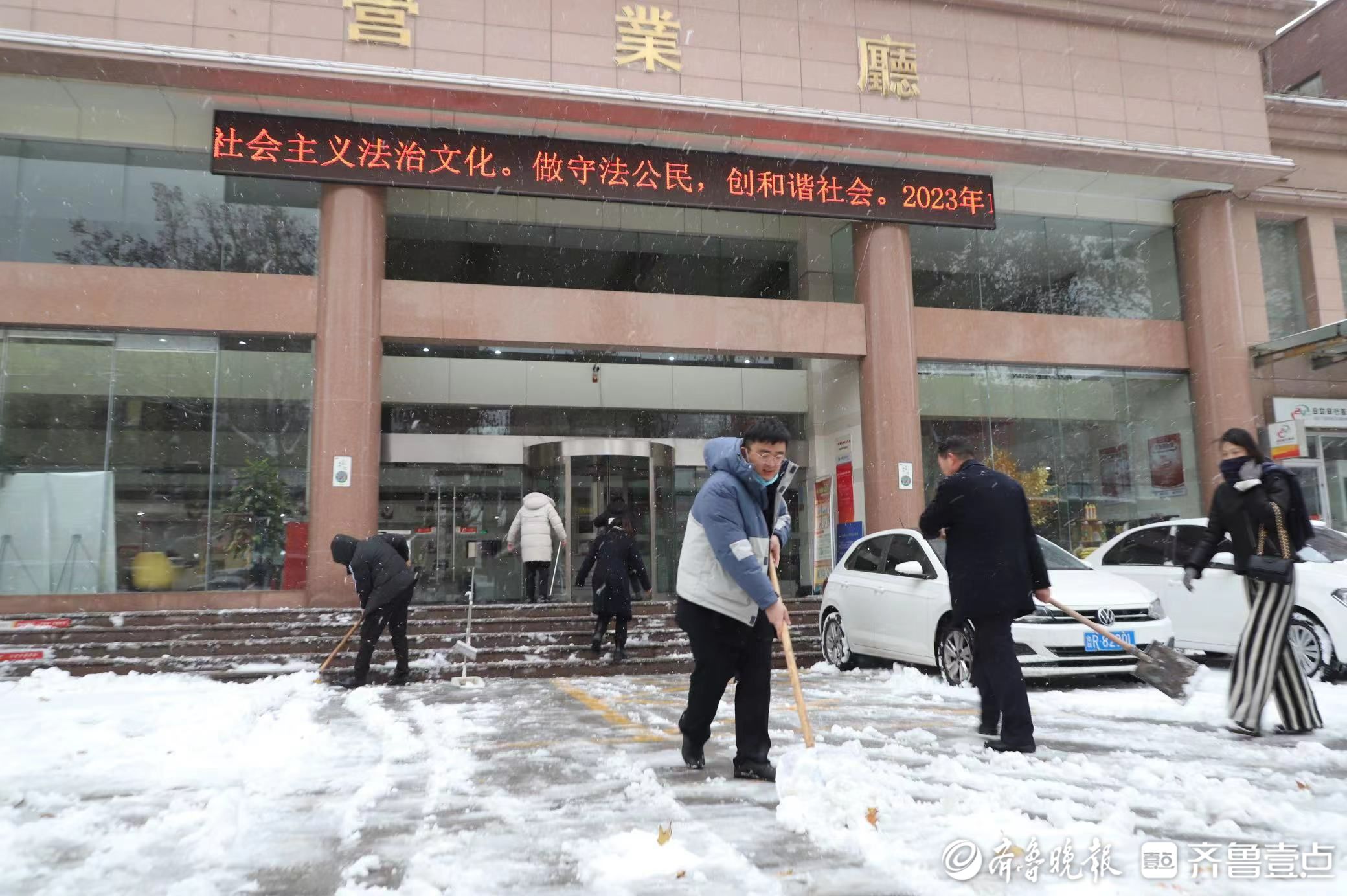 以雪为令,闻雪而动。12月11日一大早,郓城农商银行总行员工不约而同地来到单位,不顾路途的寒冷,冒着飕飕的寒风和飘落的雪花,纷纷行动起来,开始了除雪行动。大家拿起铁锨、扫帚、搓子,各有分工,互有配合;营业部在主任侯树辰的带领下,内外勤人员积极参战,挥舞铁锨扫帚拖把,认真清理台阶、无障碍通道等每一处积雪,保障行人和客户来往安全。