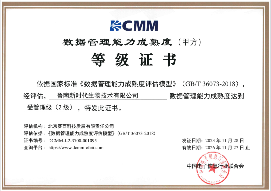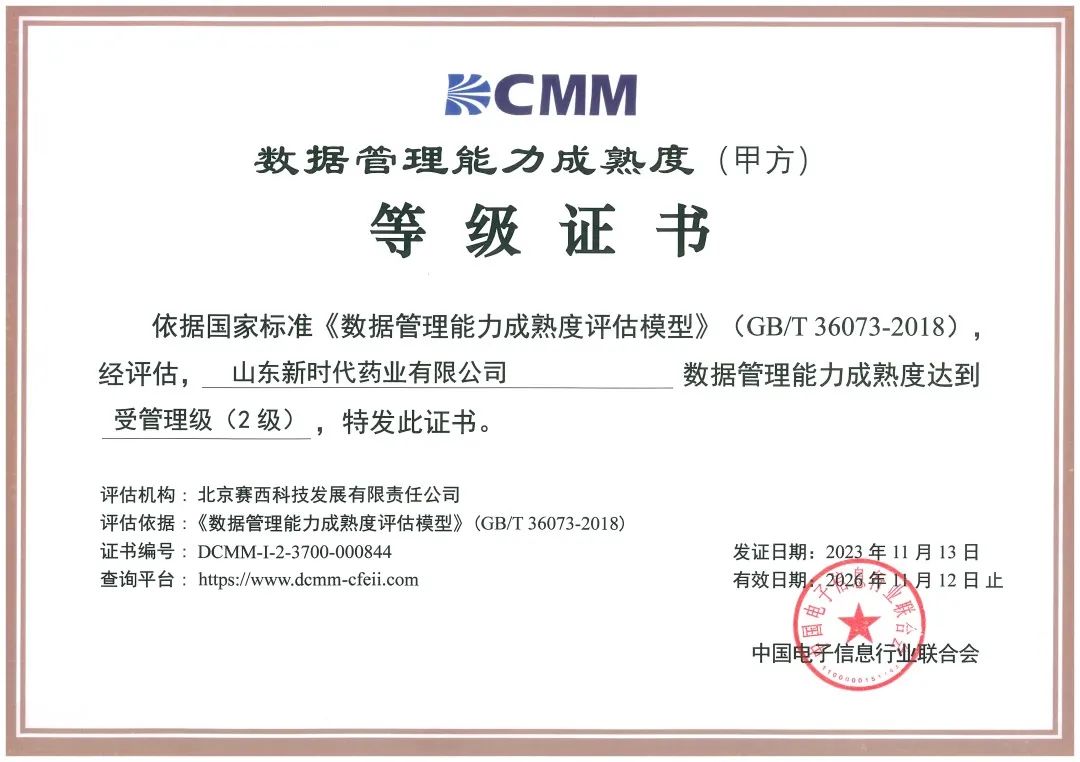 近日,山东新时代药业有限公司、鲁南新时代生物技术有限公司分别收到中国电子信息行业联合会颁发的DCMM数据管理能力成熟度证书,标志着公司在数据管理能力方面上取得显著成效、获得国家认证。
