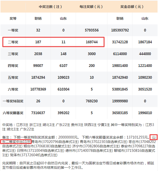 本期一等奖井喷32注,单注奖金579万余元,大奖出自全国7地,其中广东中得22注,江苏和贵州各揽获3注,浙江、湖北、陕西和宁夏各中得1注。按照12亿大派奖规则,本期诞生26注一等奖特别奖,大奖出自江苏(3注)、湖北(1注)、广东(22注),单注奖金76万余元,常规奖+特别奖单注奖金合计达到656万余元。本期二等奖开出187注,单注奖金16.9万余元。本期筹集公益金1.65亿元,计奖结束后奖池余额26.25亿元。