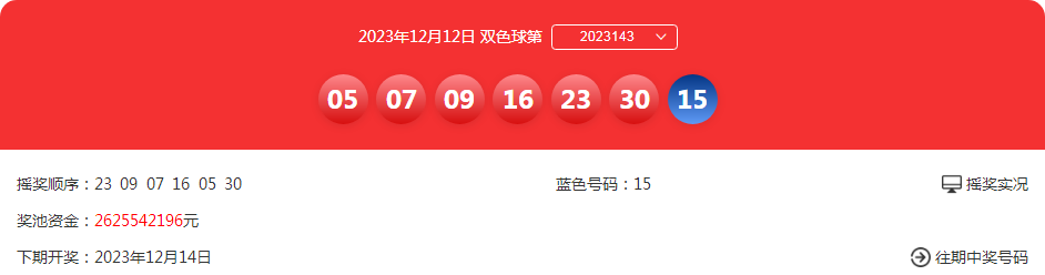 2023年12月12日,福彩双色球第2023143期开奖,同时本期还是双色球12亿大派奖的第15期开奖。本期开奖号码红球:05 07 09 16 23 30;蓝球15。