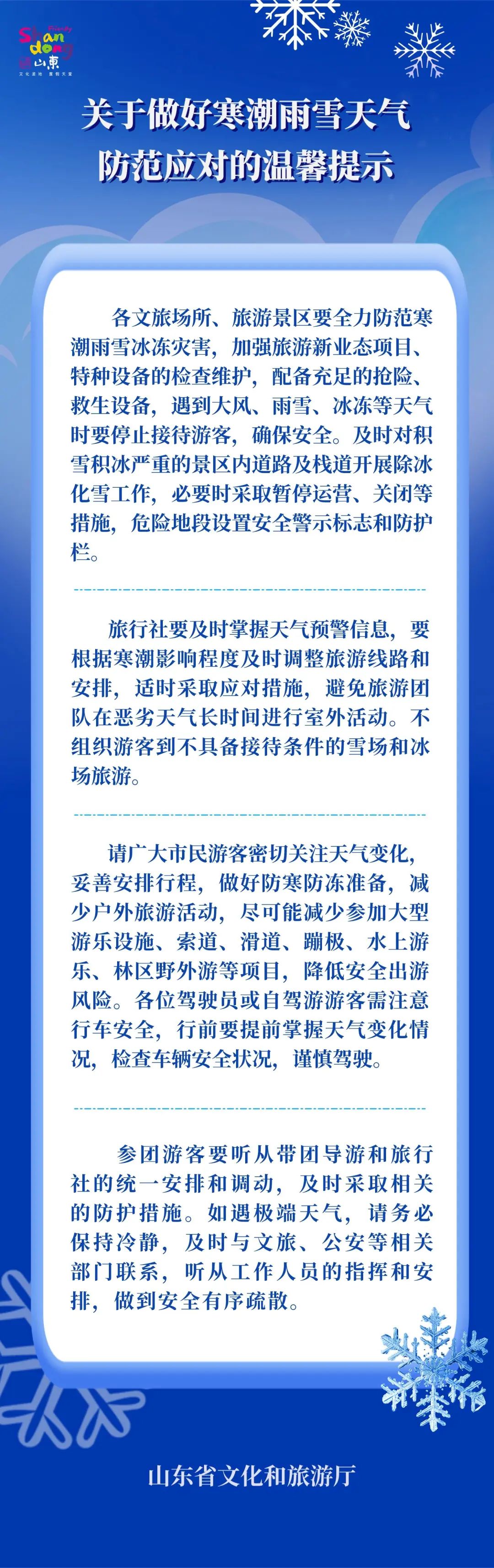 寒潮来袭!山东省文化和旅游厅发布温馨提示 大众报业·齐鲁壹点 2023-12-13 3025 见习记者 何雨晴 山东省气象台于12月13日11时00分发布暴雪黄色、道路结冰橙色、寒潮黄色和海上大风黄色预警:受强冷空气和暖湿气流共同影响,预计13日下午至16日山东省将出现寒潮、雨雪和大风天气。为切实做好寒潮雨雪天气防范应对,山东省文化和旅游厅发布温馨提示: 责任编辑:何雨晴